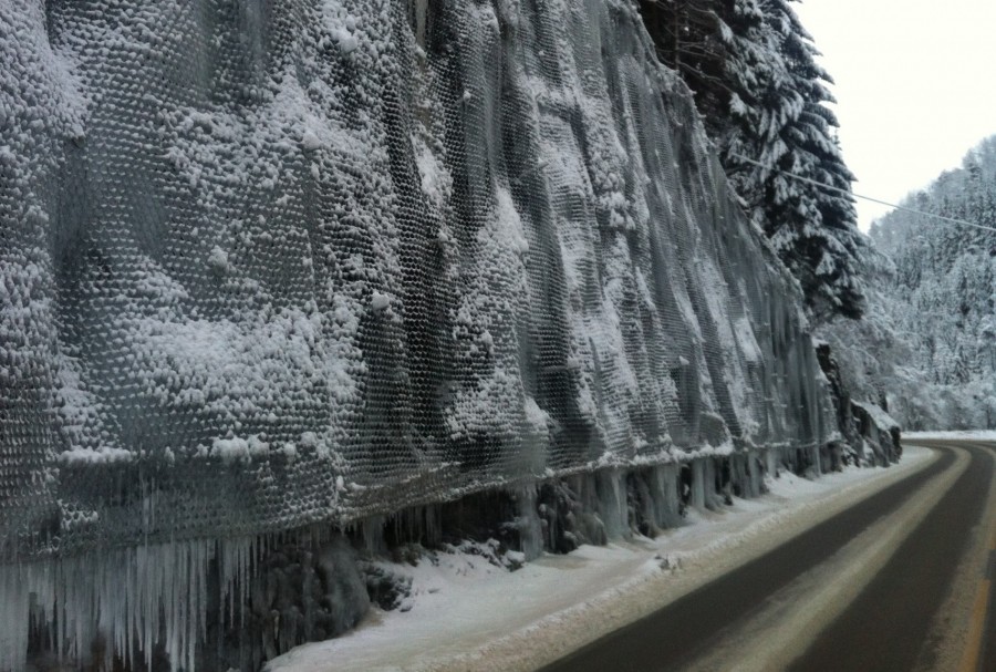 For å hindre at mindre stener og isblokker faller ut i veibanen benyttes is- og steinsprangnett.